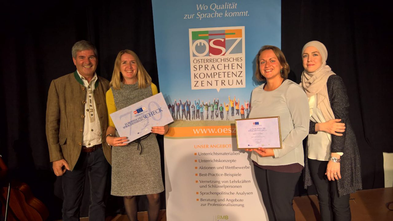 Die Sprachengruppe Schwaz wurde für ihre Arbeit mit dem Europäischen Sprachensiegel des ÖSZ (Österreichisches Sprachenkompetenzzentrum) ausgezeichnet. Überreicht wurde der Preis am 28.9.2017 im Rahmen des Europäischen Tages der Sprachen in Graz vom Leiter des ÖSZ und Vertretern von Bildungsministerium sowie Erasmus+.