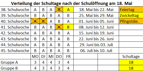 - Jede Gruppe hat an einem der beiden Freitage nach den Feiertagen im Mai und Juni einen verpflichtenden Unterrichtstag.